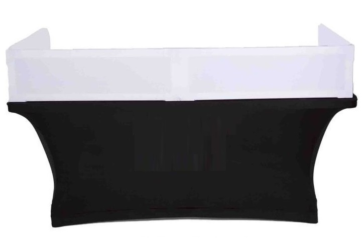 Table topper for standard 4 ft. table. ABS Square tubing & Steel corners with a silver powder coat finish. Custom hinges for easy set up/tear down(folds in and out). Comes in white with the option to add the SS-TTP401001-B to change it to black. Full length zipper to slip over frame.