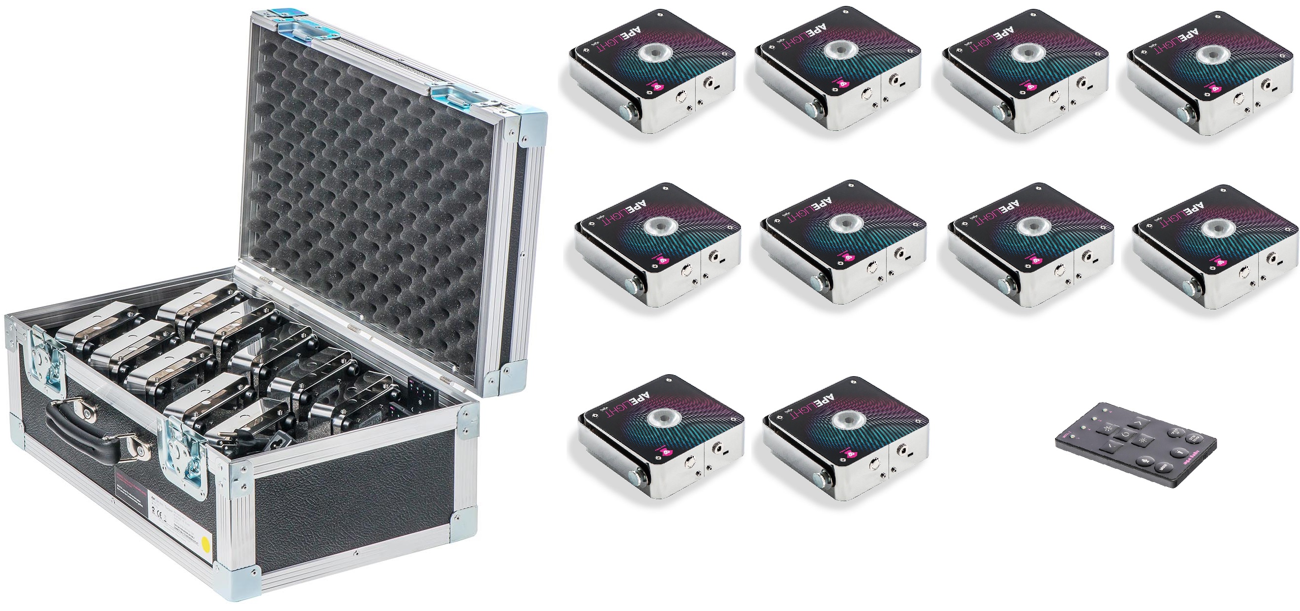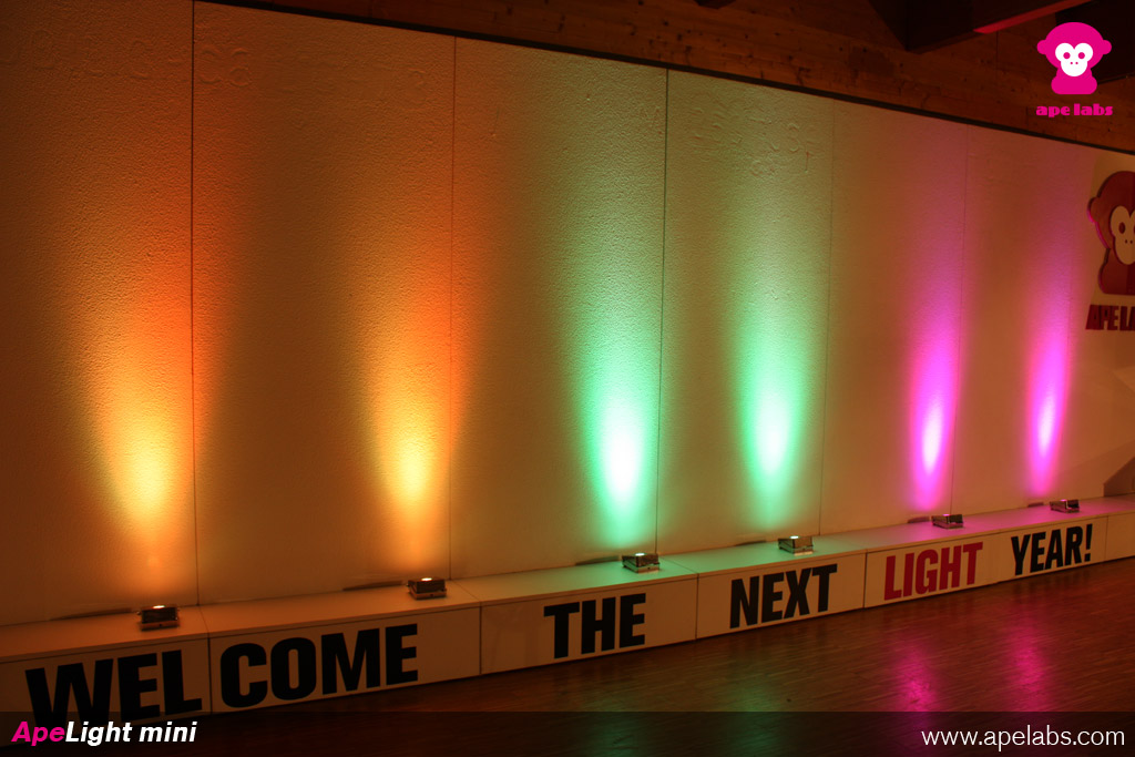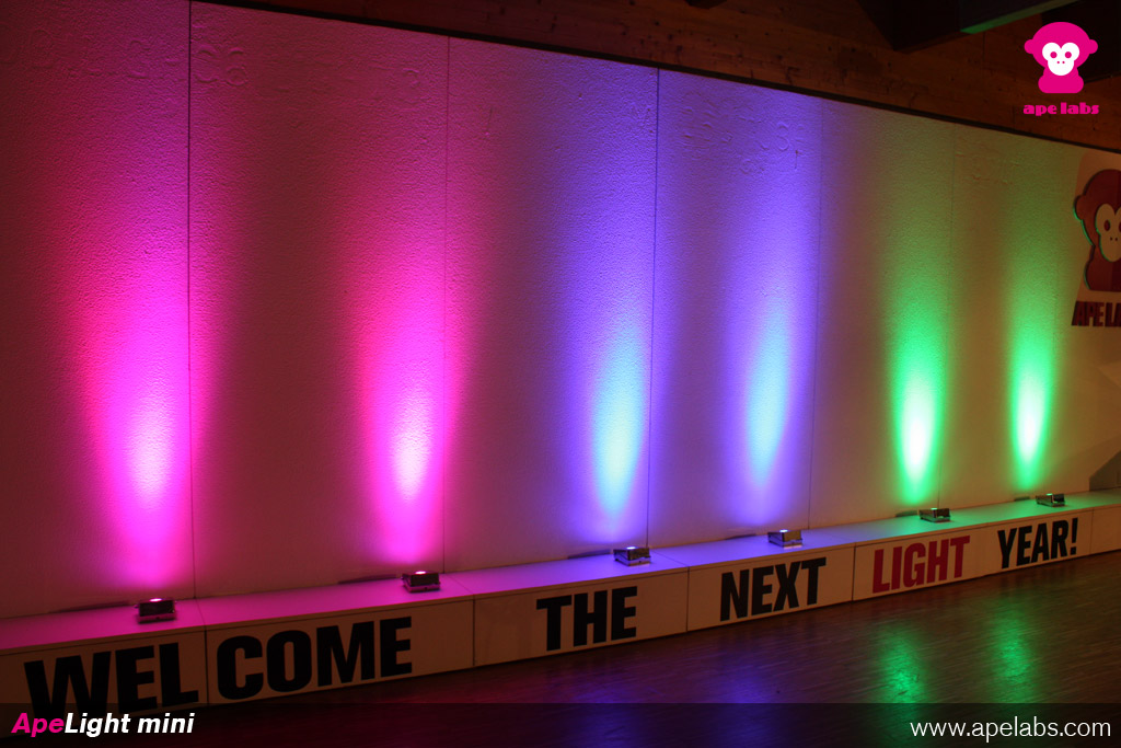 All ape labs products are compatible with each other and can be controlled by the same Remote Control or W-APE Transceiver. All colors and programs match across the different device types. ape labs devices communicate with each other to produce an uniform light image and to forward the radio signals to remote devices.