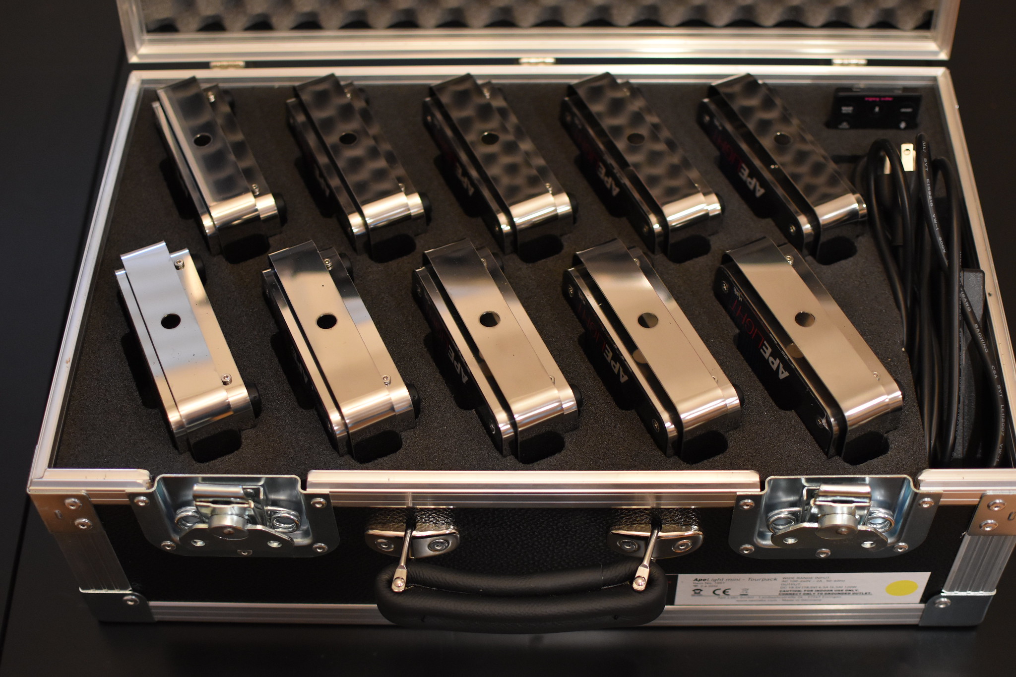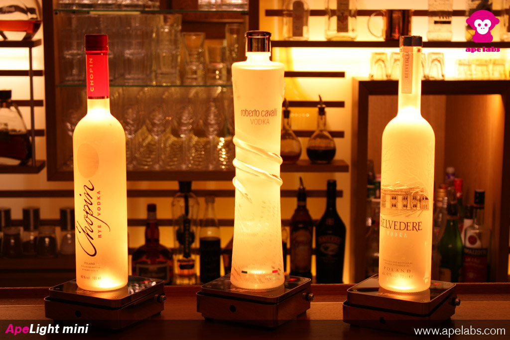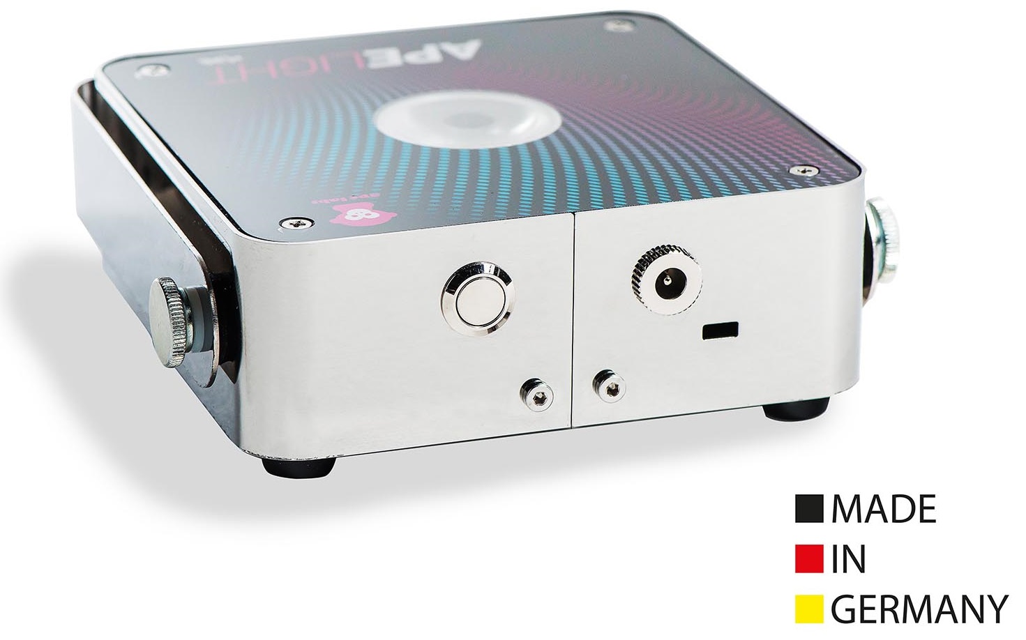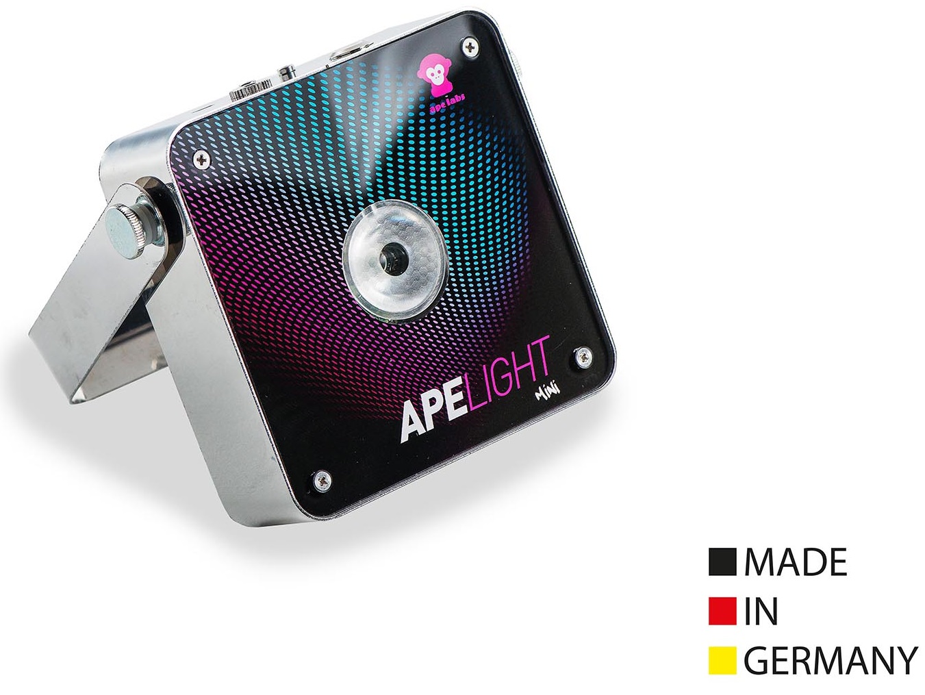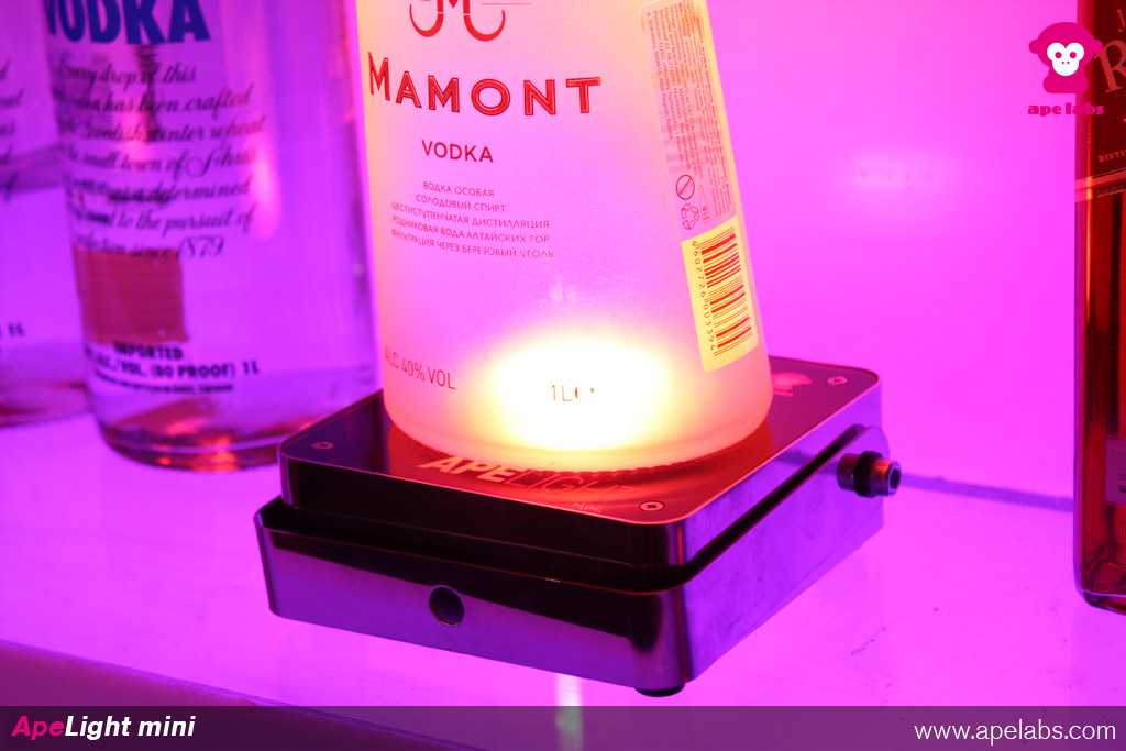 You can use the ApeLight mini for traditional uplighting or us it as a centerpiece- lighting and light up bottles or glasses. The housing is made of tough stainless steel. The surface is made of 5 mm strong acrylic glass. A mechanical load weight of 70 kg on the top of the unit is no problem. The electronic in the inside is insulated against temporary infiltration of liquids. A mounting bracket for trussing applications or to adjust the view angle for uplighting is in scope of delivery.