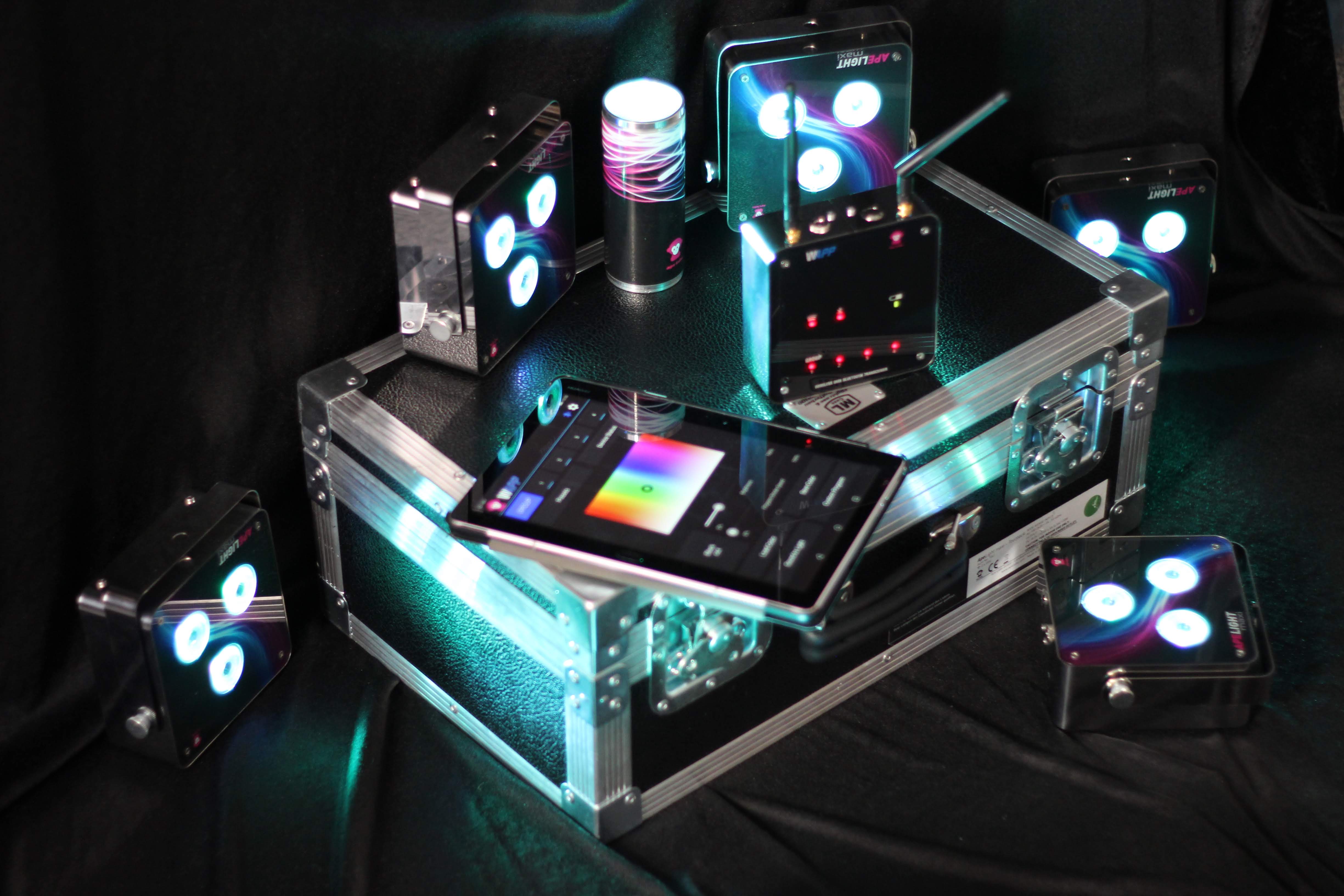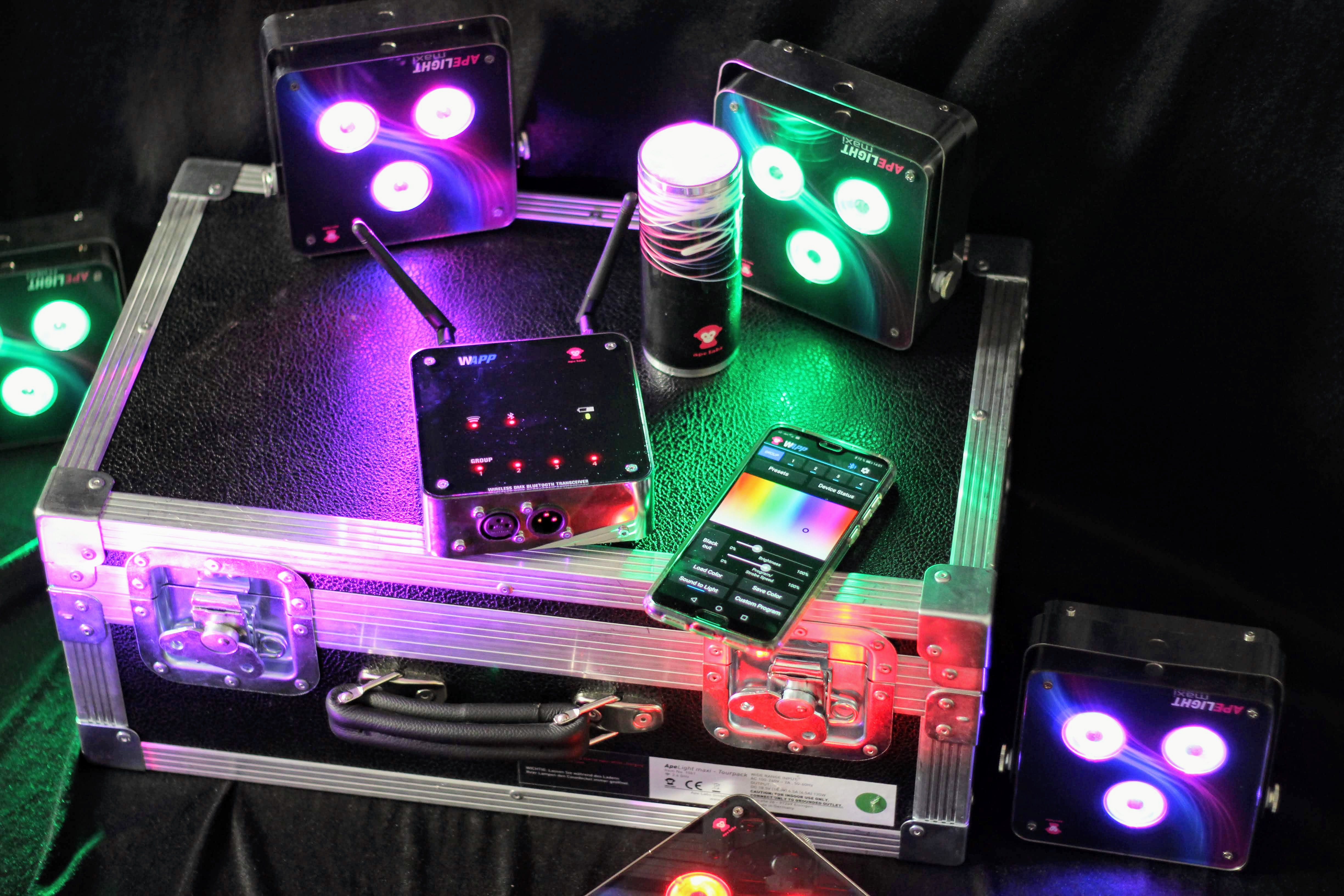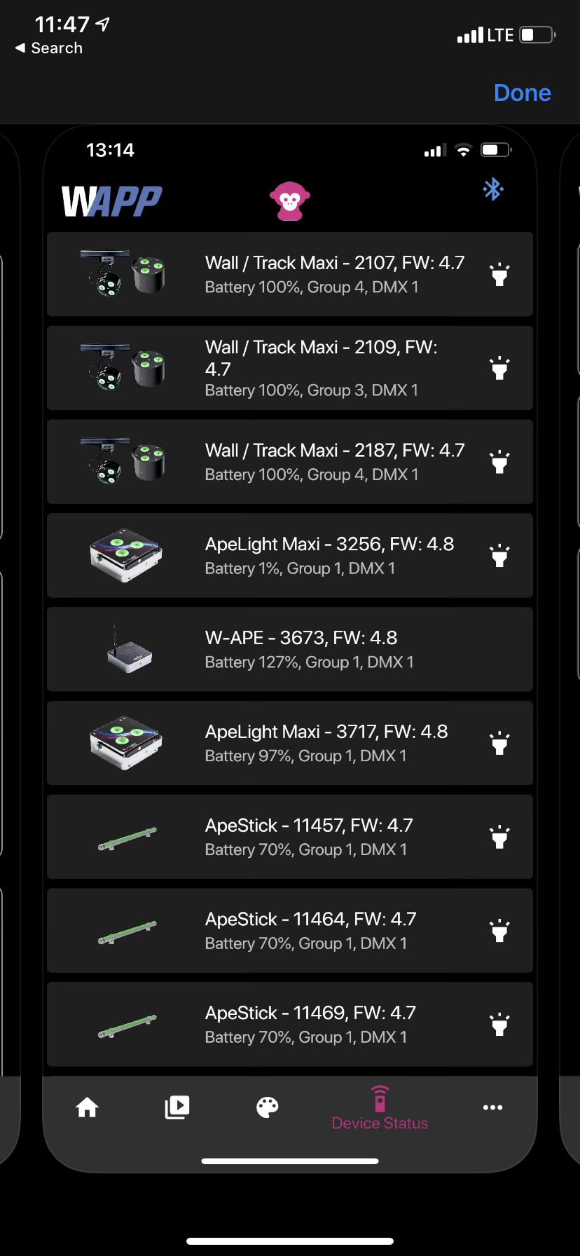 Whether you're using it as a DMX transmitter for your controller, a wireless receiver for non-Ape Labs lights, or simply as an app interface, the W-App delivers maximum flexibility. Its built-in battery ensures 50 hours of wireless performance, making it ideal for long events. You can wirelessly address lights, update firmware, adjust brightness, create custom color palettes, and more—all from the app.