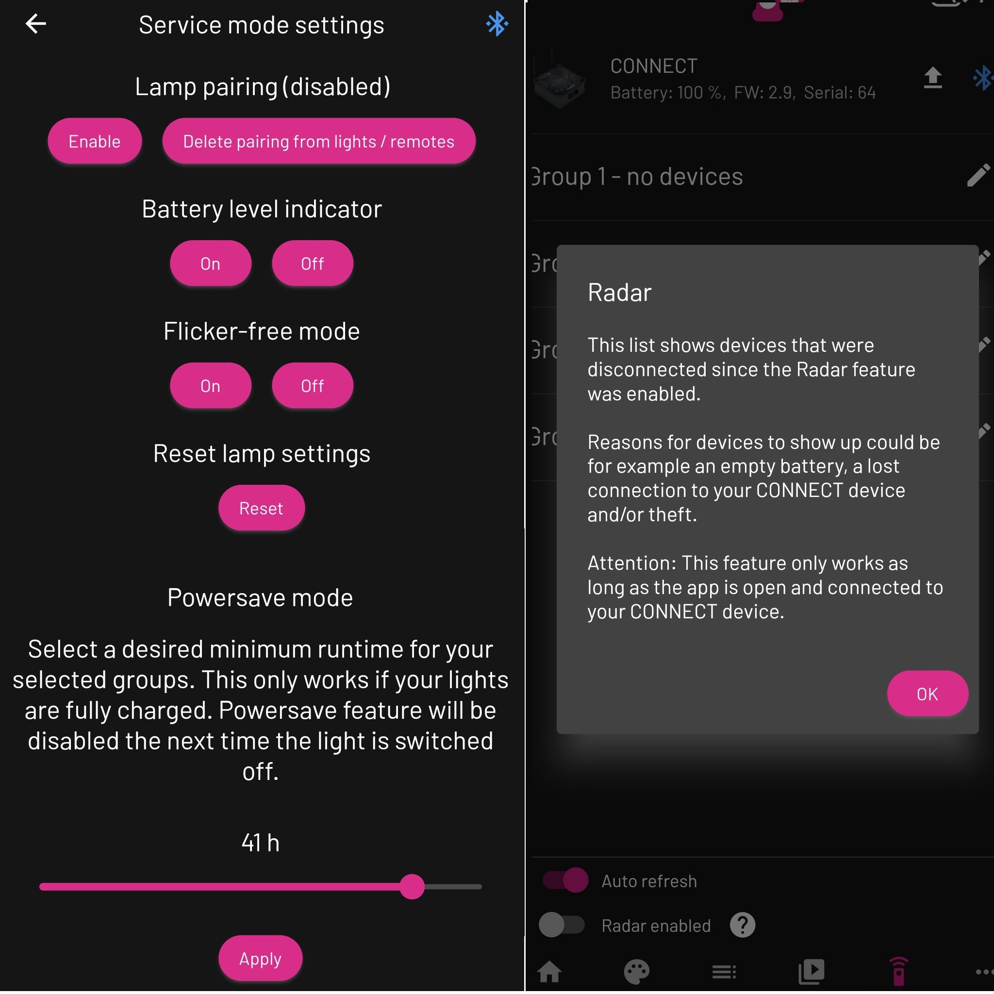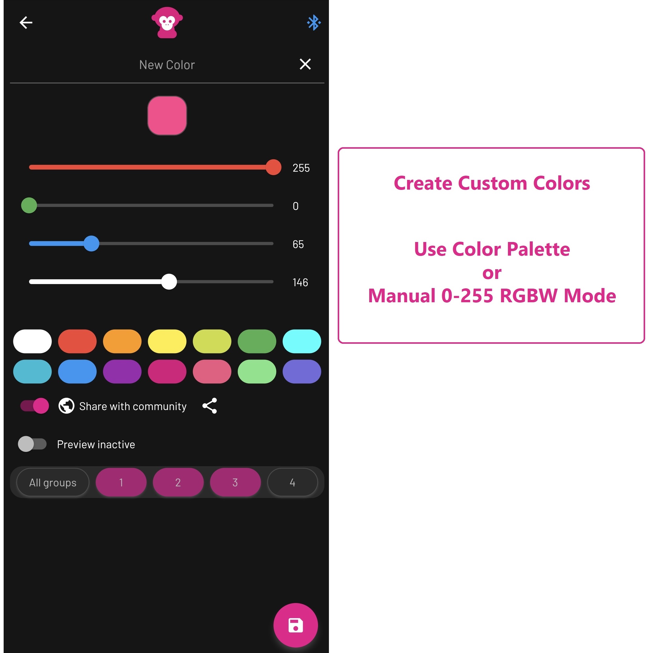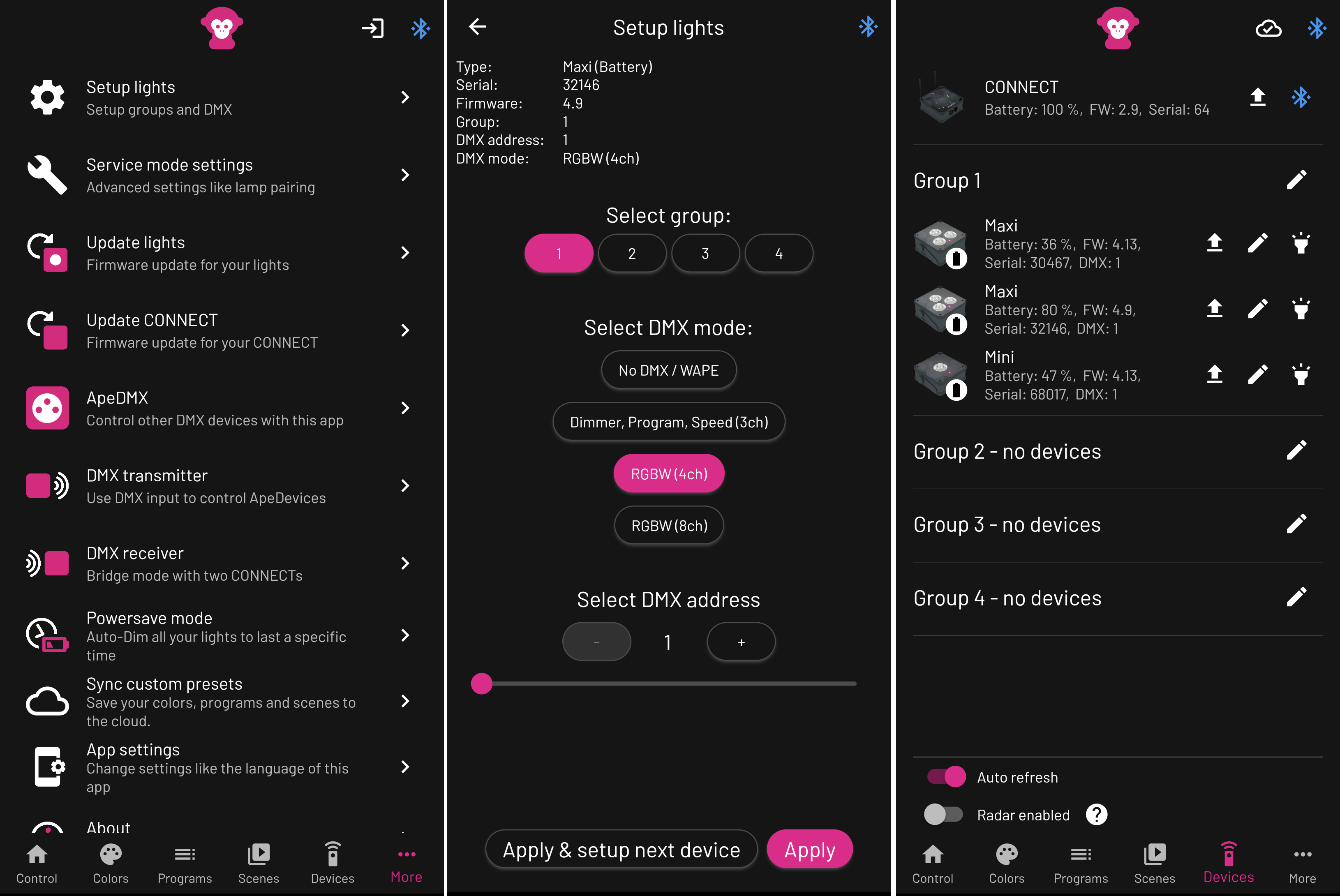Whether you're using it as a DMX transmitter for your controller, a wireless receiver for non-Ape Labs lights, or simply as an app interface, the W-App delivers maximum flexibility. Its built-in battery ensures 50 hours of wireless performance, making it ideal for long events. You can wirelessly address lights, update firmware, adjust brightness, create custom color palettes, and more—all from the app.