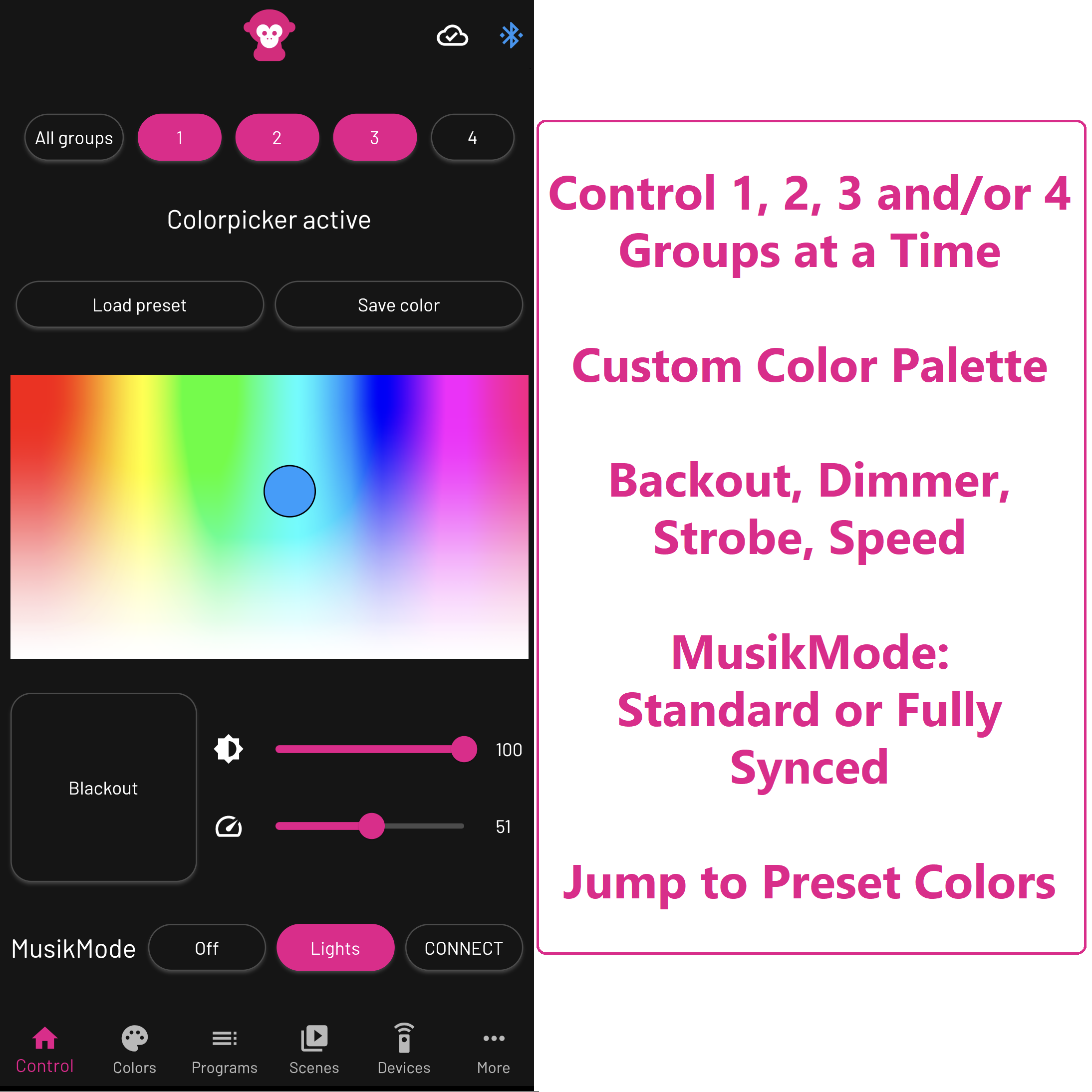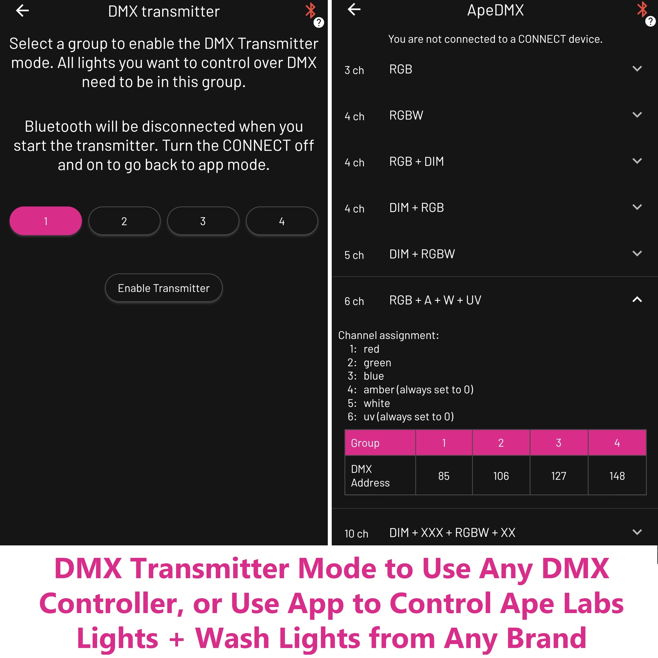The Ape Labs W-App is a compact and powerful Bluetooth DMX transceiver designed to control Ape Labs lighting wirelessly from your smartphone or tablet. With a massive 1,000ft wireless DMX range, this versatile device functions as a DMX transmitter or receiver, offering intuitive app-based control, group management, and sound-active syncing for DJs, lighting pros, and event producers.