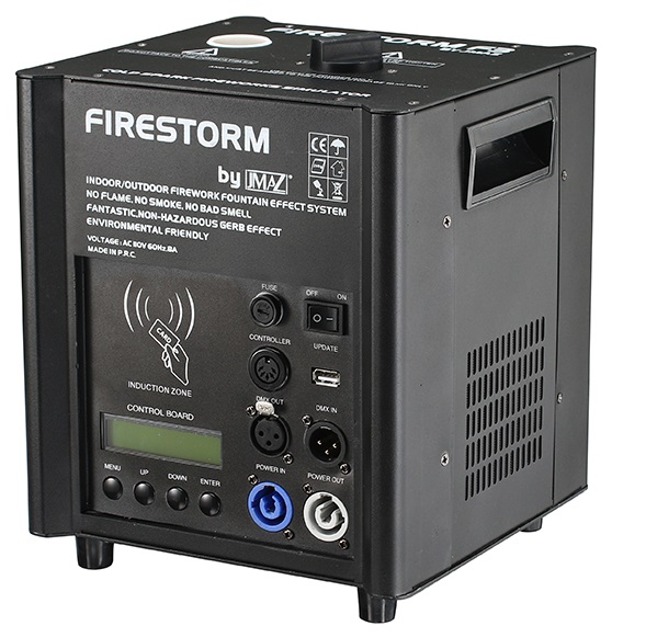 JMAZ Firestorm F3 Package provides high-impact visual effects in a safe and manageable format. This professional cold spark system includes two 500W Firestorm F3 units capable of producing adjustable spark effects from 3 to 13 feet in height. Users can select spark durations of 5, 10, 20, or 30 seconds and toggle between three spark height modes — low, medium, and high — for full visual customization.