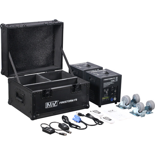JMAZ Firestorm F3 Package is a complete cold spark machine solution featuring two 500W spark units, a durable road case with locking casters, and all required accessories — including granules, power cables, and remotes. Designed for professional use, it delivers safe and eye-catching spark effects with adjustable height and timing, making it ideal for weddings, concerts, stage shows, and special events.