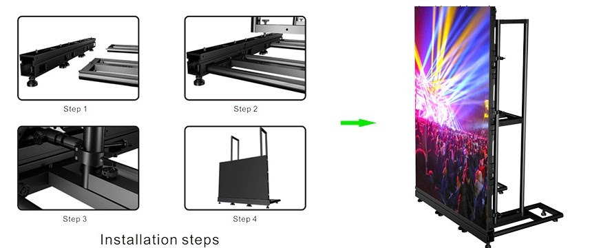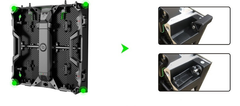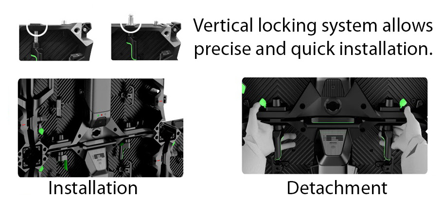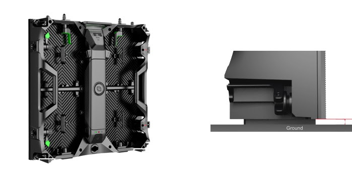 Videos walls can be set up in a curved fashion since each panel can be connected +/- 0, 2.5, or 5 degrees. Automatic fast locks make is super easy (connect and lock each panel in less than 2 seconds). Each panel has an independent power supply box, flip-up protectors for all four corners, and support for either ground stacking or optional hanging rig bars.