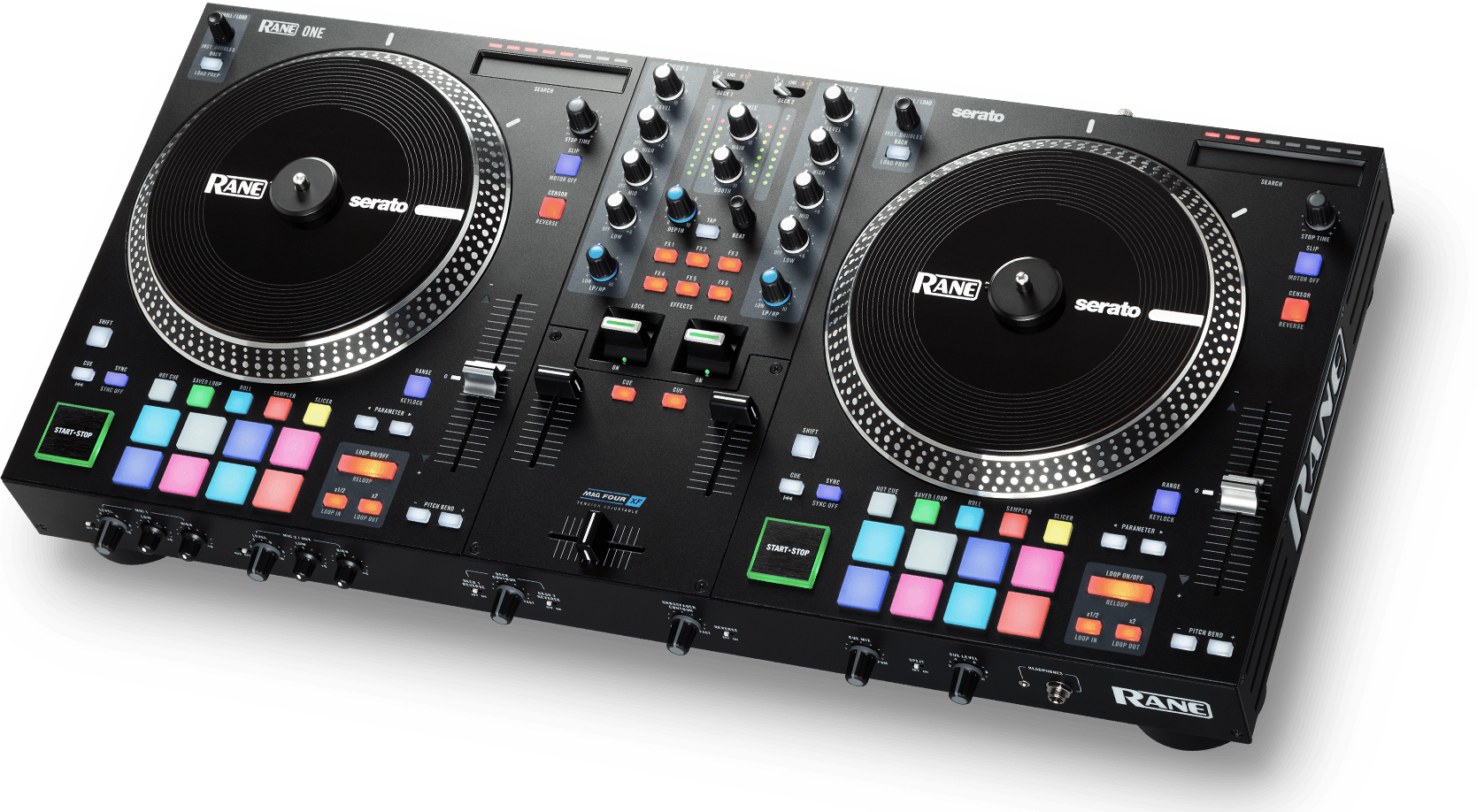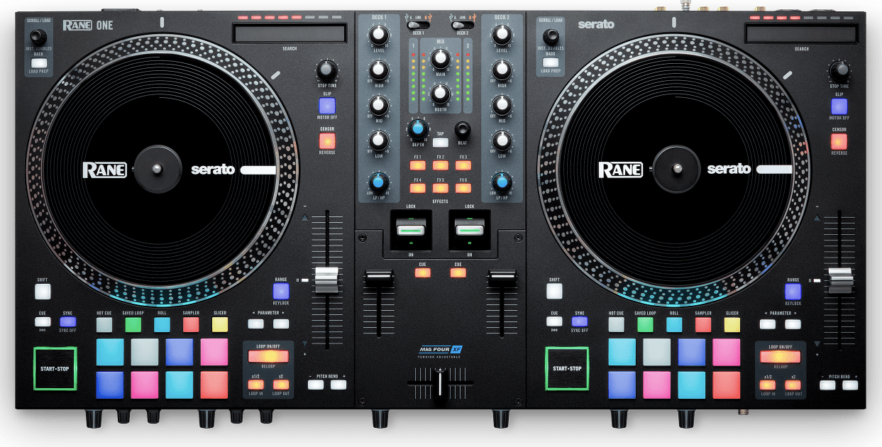 The RANE ONE is a high-performance motorized DJ controller engineered to provide a vinyl-like feel in a modern setup. The 7-inch motorized platters offer authentic control, while the MAG FOUR crossfader and radio-style FX buttons elevate your performance with smooth, professional functionality. The controller’s intuitive layout features a dedicated loop section, 3-band EQ, high/low pass filters, and performance pads, all crafted to put control at your fingertips.