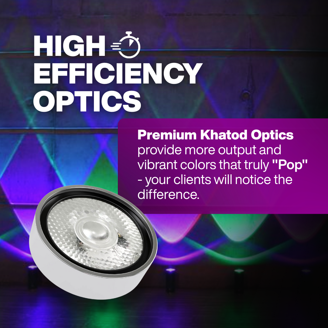 The Ape Labs Can 2.0 IP comes standard with 65° Effect Lens, but four alternative optics are available. Below are the LUX ratings for each color, with each beam angle, at both 1m and 2m distances.
