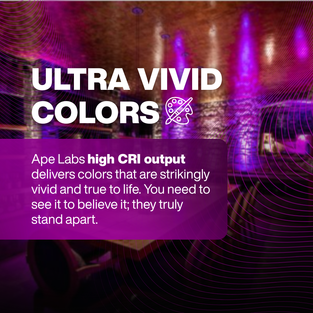 The Ape Labs 2.0 and 2+ series may look the same on the outside, but there’s a big difference inside. The new Ape Labs 2+ series features upgraded internal hardware designed to support an exciting lineup of future software updates. While both the 2.0 and 2+ models perform identically right now, the 2+ models are built for next-generation features rolling out in 2025 and 2026—including advanced AI enhancements that elevate real-time music analysis and automate lighting effects far beyond the already impressive capabilities of Ape Labs’ iconic MusikMode.