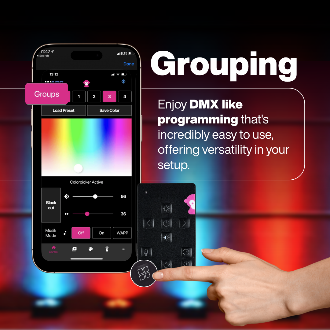 Not a fan of DMX? No problem. While all Ape Labs lights come equipped with wireless DMX receivers, most users prefer controlling them with the intuitive iOS/Android app or RF remote. These control options allow for easy grouping, where multiple lights (regardless of SKU and with no limit on quantity) can be set to one of four groups. You can change colors, adjust brightness, set programs, tweak speed or strobe settings, and more—all without affecting lights in other groups. Additionally, you can control multiple groups simultaneously. With the app, you can create scenes that allow all groups to be independently set with just the press of a button. (To use the app, "Connect" is required and sold separately.)