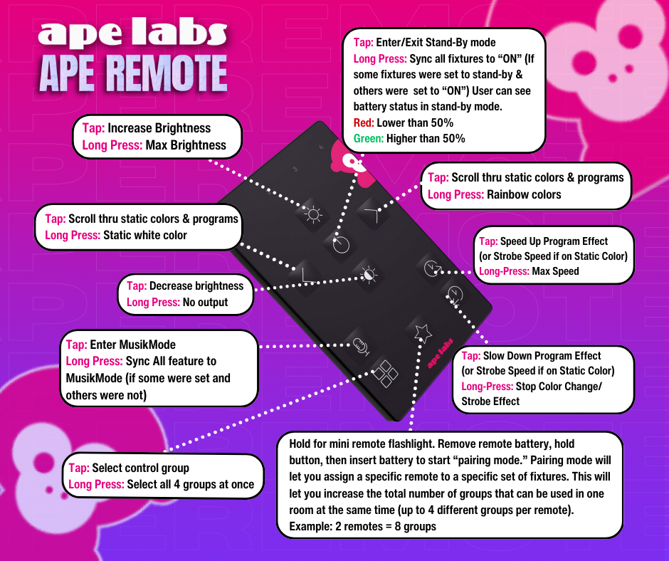 The renowned Ape Labs MusikMode stands unrivaled in the industry. With zero programming required, a single button press effortlessly synchronizes all Ape Labs products in the room (regardless of SKU) to collaborate and create a constantly evolving light show perfectly timed to the music. This isn't the typical "sound active" mode you've seen before; it's a genuine light show that would challenge even a professional lighting designer to replicate through DMX programming.