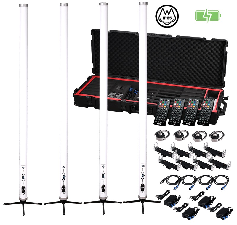 The JMAZ Electro T5 4PK is a professional-grade LED tube lighting kit designed for outdoor and event applications. Featuring four 100W RGBW+WW LED tubes with an ultra-high CRI of ≥ 95, this lighting kit delivers exceptional color accuracy and dynamic effects. With an IP65 rating for outdoor use, wireless DMX and Wi-Fi control, and up to 15 hours of battery life, the Electro T5 4PK ensures versatility, reliability, and high-performance illumination.